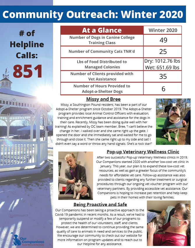 Here’s the first look at our Community Outreach series where we get to highlight the impact of our programs to the community. Though the Sanctuary often gets the spotlight, Our Companions has many programs aimed at helping people and pets in our local communities. These programs include our Adopt-a-Shelter program, Canine College, our Community Cats Program and related support programs, and our Veterinary Assistance Programs. Going forward, we’ll be sharing our Community Outreach update each quarter so stay tuned!